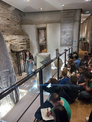 Une des visites guidées avait pour objet le patrimoine médiéval de Quimper. Chaque groupe s'est attardé devant les maisons à colombage pour évoquer techniques et matériaux ainsi que dans les rues et places principales porteuses de noms de métiers : rue du sallé, des boucheries, Kéréon, place au beurre. La visite du jardin de la retraite, jardin tinctorial au moyen âge a enchanté les enfants. Le rôle des fortifications a été évoqué puis nous sommes allés visiter la cathédrale, ses différents espaces et ses vitraux. L'après midi et inversement pour l'autre groupe, nous avons bénéficié d'une visite guidée au musée breton. Plongeant les élèves dans la préhistoire récente -néolithique- la guide a su capter l'attention de tous. La salle antique et ses trésors d'artefact a donné lieu à bien des questionnements. Enfin la salle des gisants et armes moyenâgeuses a aussi retenu l'intérêt des enfants. Une belle journée qui donnera l'occasion d'écrits évoquant la visite et le beau pique nique au jardin de la retraite.